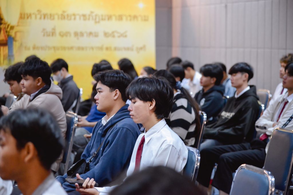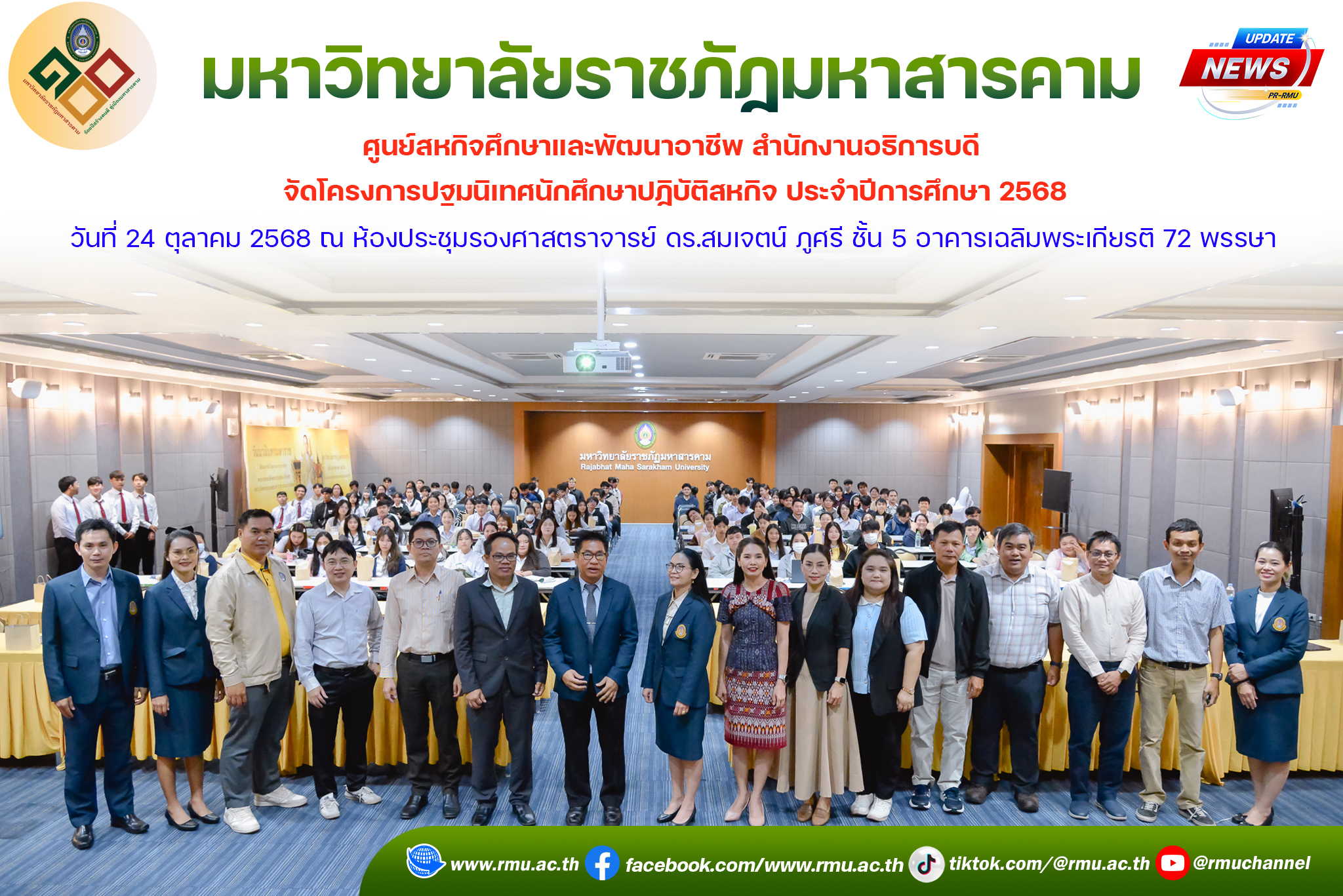 วันที่ 24 ตุลาคม 2568 เวลา 09.00 น. อาจารย์ ดร.วีระพน ภานุรักษ์ รองอธิการบดี เป็นประธานในพิธีเปิดโครงการปฐมนิเทศนักศึกษาปฏิบัติสหกิจศึกษา ประจำปีการศึกษา 2568 ณ ห้องประชุมรองศาสตราจารย์ ดร.สมเจตน์ ภูศรี ชั้น 5 อาคารเฉลิมพระเกียรติ 72 พรรษา กล่าวรายงานโดย อาจารย์ ดร.เดือนเพ็ญ ภานุรักษ์ หัวหน้าศูนย์สหกิจศึกษาและพัฒนาอาชีพ สำนักงานอธิการบดี มหาวิทยาลัยราชภัฏมหาสารคาม